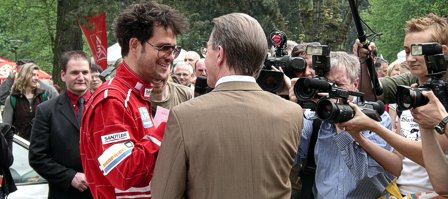 seinen Ausgang nimmt. Gegen 16.00 Uhr begrüßte die Rennleitung den neuen SPD-Chef Franz Müntefering vor der Rallyebühne, nachdem er