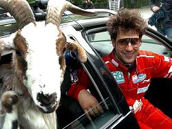 Regisseur Christoph Schlingensief zusammen mit Ziege "Parsival" in einem Wagen seiner Wagner-Rallye (Oliver Weiken/DPA) |